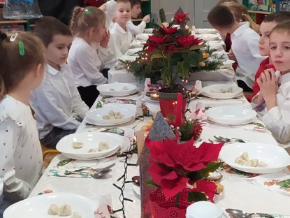 19 grudnia w świątecznej atmosferze odbył się wyjątkowy obiad wigilijny, który na długo pozostanie w naszej pamięci. Każda grupa przedszkolna zasiadła przy pięknie przystrojonym stole, by wspólnie delektować się świątecznym posiłkiem. W tym szczególnym dniu towarzyszyli nam wszyscy pracownicy przedszkola, którzy zostali zaproszeni do każdej z grup, by razem przeżywać magię nadchodzących Świąt. Pani Dyrektor złożyła wszystkim serdeczne, świąteczne życzenia oraz poczęstowała dzieci i pracowników słodkim „co […]