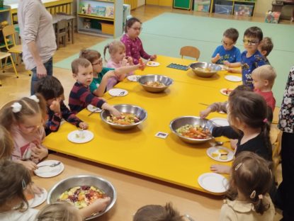 25 listopada grupa Kotki gościła terapeutkę żywienia. Pani Klaudia poprowadziła warsztaty, na których przedszkolaki mogły lepiej poznać warzywa, owoce oraz inne produkty spożywcze. Pierwsze zadanie polegało na wyłowieniu za pomocą łyżek kawałków owoców i warzyw z dużych misek z wodą. Okazało się to nie takie łatwe, szczególnie w przypadku kilku dużych marchewek. Wyłowione smakołyki szybko lądowały w brzuszkach dzieci. Podczas realizacji drugiego zadania owocami i warzywami zajadały się […]