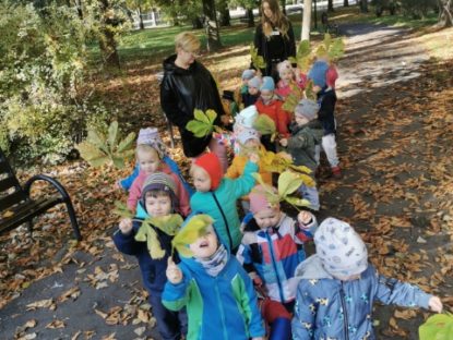 19 października najmłodsze przedszkolaki wybrały się do parku na jesienny spacer w celu obserwacji zmian zachodzących w przyrodzie. Wiele radości sprawiła dzieciom zabawa z kolorowymi liśćmi. Niektóre zabrały ze sobą do przedszkola, tworząc barwne bukiety do kącika przyrody.