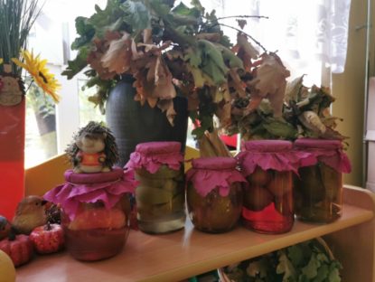 W październiku najmłodsze przedszkolaki robiły pierwsze własne przetwory z owoców i warzyw. Przygotowały kompoty z jabłek, gruszek i śliwek oraz ukisiły ogórki. Dzieciom wiele radości sprawiło samodzielne ich przygotowanie.