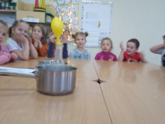 Na początku naszej przygody zrobiliśmy sobie „burzę mózgów” próbując odpowiedzieć na pytanie: co to są eksperymenty, co to znaczy eksperymentować? Pomysłom nie było końca!!! Sprawdzaliśmy potem jak będzie „zachowywał się” balon pod wpływem gorącego i chłodnego powietrza. Wykonaliśmy też eksperymenty świeczkowe, „Kolorowy deszcz”, „Burza w szklane”,” Galaktyka w słoiku” i proces tworzenia „Lampy Lava”.